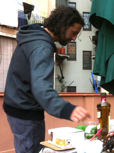 Uno de los dos anfitriones corroborando que susamigotes no han dejado ni una gota de bebercio(la botella que ven llena es de aceite)